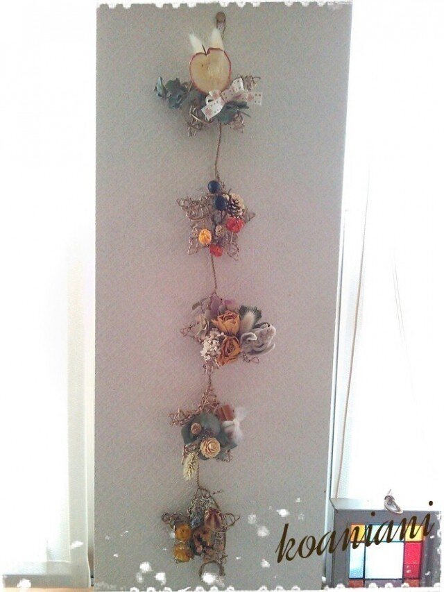 飾るスペースに応じて、こちらは縦に垂らしていますが、横にのばしたり、テーブルに置いてみたりと色々と楽しめますよ。