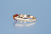 濃いオレンジ色とマットなゴールドがマッチした身につけやすいリングです。