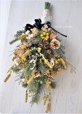 ベージュやグレージュのニュアンスカラーが美しい、ボリューム感のあるスワッグです。白バラ、ドライフラワー風の紅バラをアクセントにどこか時間を超えた幻想的な雰囲気も感じられてとても心惹かれます。 また、スワッグの向きや花器に応じた飾り方を提案して下さっているので、これから色々な表情を見つけて行ければと思います。今回も素敵な作品をありがとうございました。