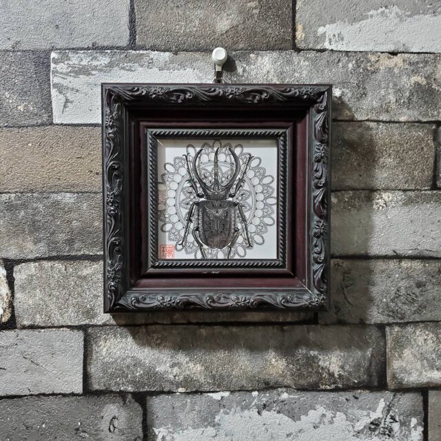 原画 一点もの ボールペンアート 額装付き 百貨店作家 人気 ボールペン画 絵画 コーカサスオオカブト カブトムシの絵