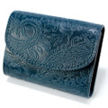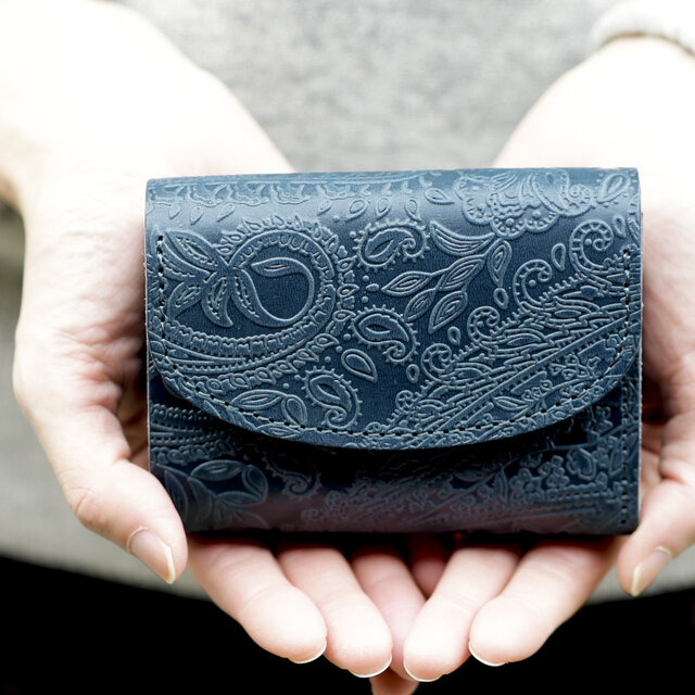 ペイズリー型押し 三つ折り コンパクトウォレット MANUEL ネイビーミニ財布 ヌメ革