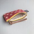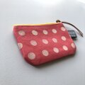 くっきりと濃く、よくあるピンクにわずかに黄色を混ぜたような大人が持てるピンク色の綿の8号帆布にハンドプリントで水玉(ドット)模様を施し小さめのポーチを制作致しました