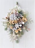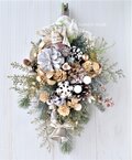 ベージュやグレージュのニュアンスカラーが美しい、ボリューム感のあるスワッグです。白バラ、ドライフラワー風の紅バラをアクセントにどこか時間を超えた幻想的な雰囲気も感じられてとても心惹かれます。 また、スワッグの向きや花器に応じた飾り方を提案して下さっているので、これから色々な表情を見つけて行ければと思います。今回も素敵な作品をありがとうございました。