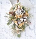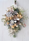 素材:アーティフィシャルフラワ-(造花):コニファー(3種類 一部ラメ付き)・ユーカリ・スノーボール・ゴールドのボール、など。