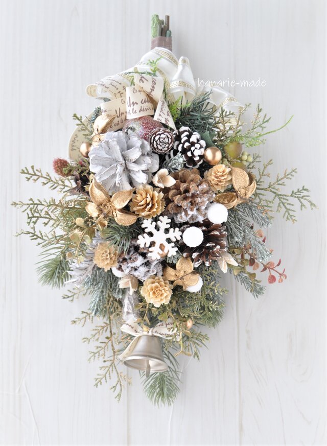 その他:リボン飾り(英字プリントコットンリボン・クリームとゴールドの艶やかなリボン:どちらも取り外しできません)・オーナメント(シャンパンゴールドのベル・コットンリボン添えて:取り外しできません)・オーナメント(雪の結晶 白、木製 取り外しできません)。