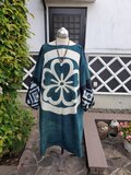 大きな紋、型染め、筒描きなどをパッチしてワンピースを作りました。