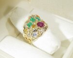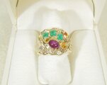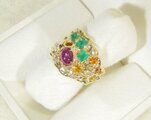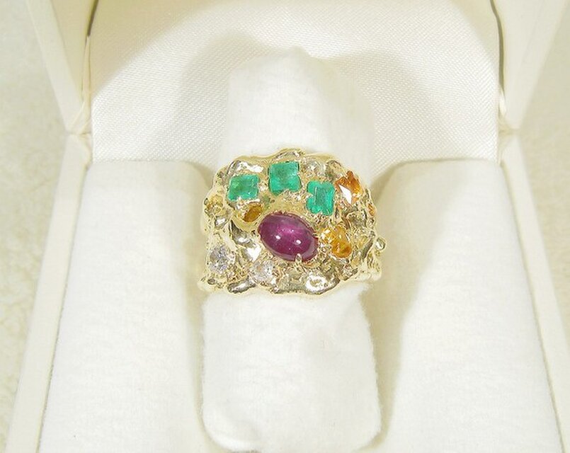 ルビー、エメラルド、シトリン、再生ダイヤモンドを一点もの枠に留めた色鮮やかな指輪です。