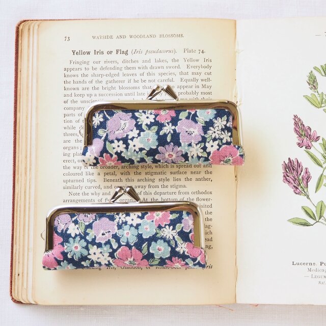 紺地にパープル、ピンク、ブルーの花柄ハーフリネン生地で作りました。