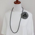 ご入学式、ご卒業式、ご結婚式などで活躍するコサージュとパールロングネックレスピーコックグレーです。