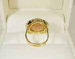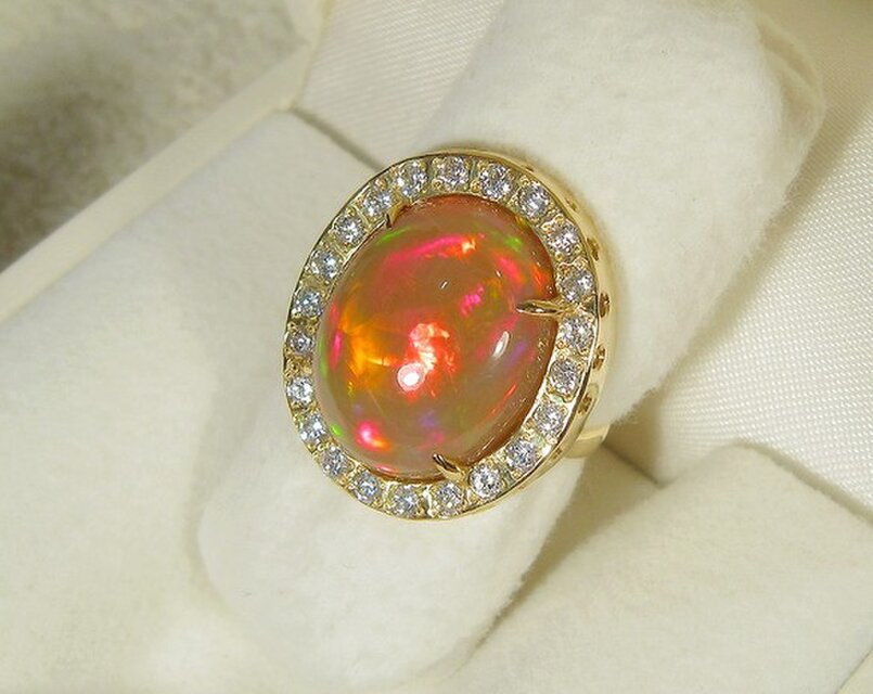 赤を中心とした強い発色の遊色効果(プレイオブカラー)が見られる高品質で大粒のオパールを、K18イエローゴールドの枠に留めた指輪です。