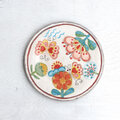 花と蝶を明るくユーモラスにお皿に描き込んだ陶器の色絵皿です。