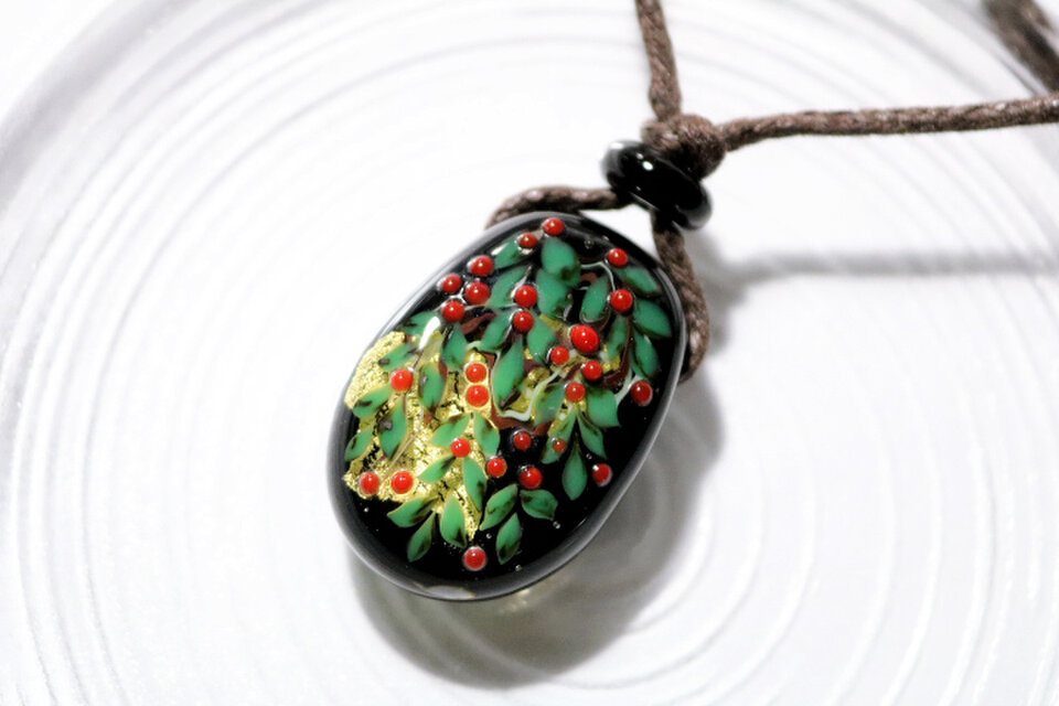 バーナーワークの技法で制作した、手作りのガラスのペンダントです。