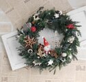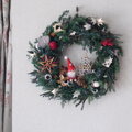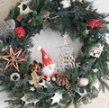 プリザーブド加工されたヒムロスギ、マウンテンジュニパーなどのコニファーにユーカリの葉を入れたリースを土台にし、かわいい小人と手袋を見え隠れさせたちょっとメルヘンチックなクリスマスリースです。ヒイラギの葉やシナモンやスターアニス、松かさ、ドングリなど木の実をふんだんに入れ、賑やかで豊かな森を表現してみました。クリスマスの賑やかな楽しさを出すためにわらを編み込んだ北欧調のオーナメントをを入れ、ナチュラルな温かみのある雰囲気にしてみました。