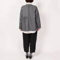 前後の部分ギャザーと切り替えデザインが、無地ながらも存在感を際立たせます。