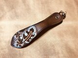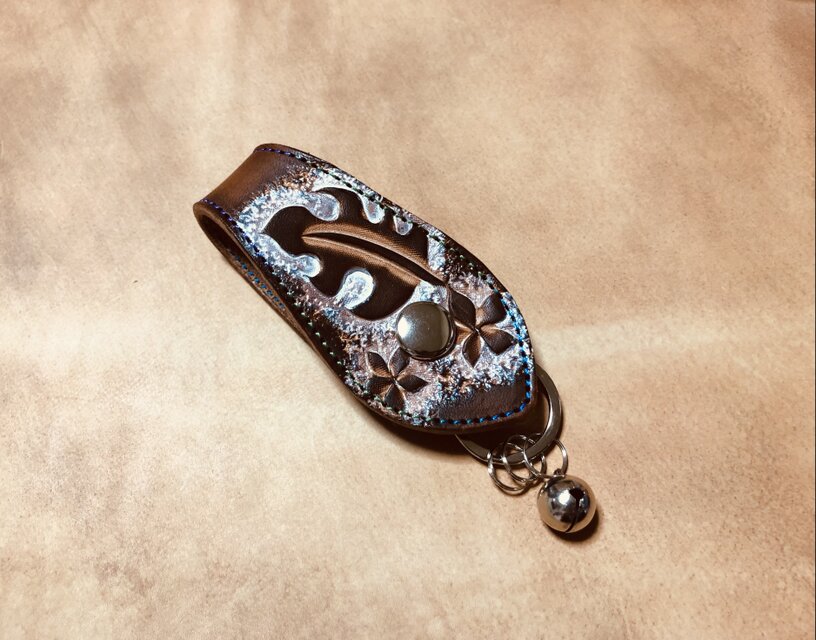 こちらの商品はヌメ革をナイフでカットし外周をツールでトントンカービングしロイヤルブルーに染めました。