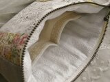 エクリュリネン、フランスのアンティークアイレットレース、ヴィンテージのリバティのような風合いのプリントを組み合わせたポーチです