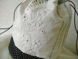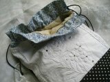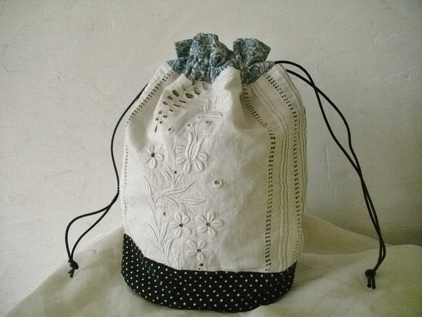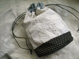 アンティークレース、黒リネン、黒×オフホワイトドットを合わせた巾着バッグです