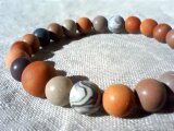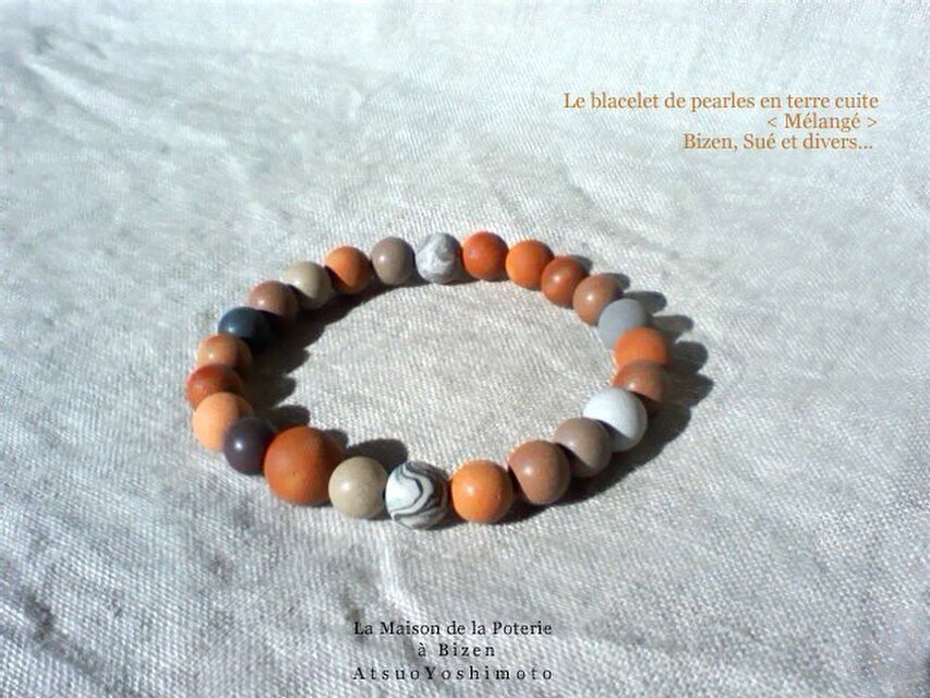 須恵器、備前焼、練り込みや弁柄を混錬した陶器と磁器の珠を繋ぎ合わせた味わい深い色合いで仕上げました。