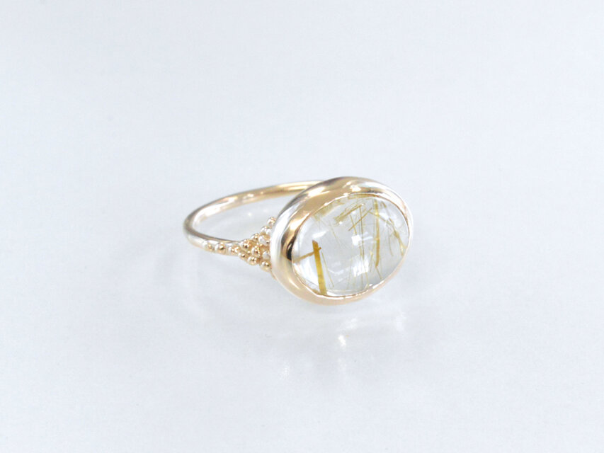 都会的な印象から、ゴールドカラーでクラシックなデザインに仕上げました。サイドの粒がルチルクォーツを際立たせます。