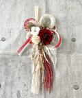 花材:プリザーブドフラワーユーカリエキゾチカ・サンキライ・ドライフラワー山シダ・レースファーン・ワタ・松かさ・ワタカラ・ソーラーフラワー・マシェリローズ・ウッドプレート・水引・丸藤飾りなど