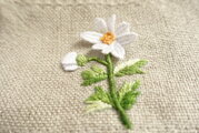 左下の平織の部分に花びらが立体のひなぎくを刺繍しました。 布の上下は三つ折りミシンをかけてありますが、左右両サイドは織りっぱなしです。