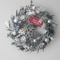 雪に閉ざされてた森の中の一軒家で迎える静かなクリスマスを思い描いて作りました。ホワイトにペインティングされたプリザーブドフラワーのアイビーやユーカリ、マウンテンジュニパーで作ったリースを土台に、雪をイメージするアーティフィシャルフラワーのどコニファーや雪の結晶のオーナメントを散りばめました。また、フワフワした雪玉のような千日紅を所々に入れてみました。
