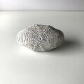 今回はとても美しい輝きのビーズを見つけたので、そのビーズをふんだんに使ったがま口を編みました。銀引き・レインボー加工されたビーズは角穴になっており(通常は丸穴)、内側から面で光るので輝きも強く、表面はレインボー加工されているので、シャボン玉が太陽に当たった時のように虹色に輝きます。
