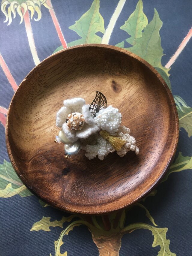 使用素材は羊毛糸、コットン糸、仏蘭西産スパンコール、チェコガラスパーツ、淡水パール、パール加工ビーズ、メタルパーツ、ガラスビーズ、タッセル等です。