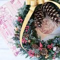 存在感抜群の松ぼっくりに、ペッパーベリーの実を入れた北欧風のクリスマスリースです。