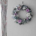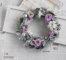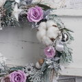 プリザーブド加工されたラベンダー色のバラと小菊にふわふわした白いコットンボールを入れ、大人可愛いリースを作ってみました。ホワイトにペインティングされたプリザーブド加工されたアイビーととエメラルドヒバを土台にしたリースにシルバーやホワイト系にペイントされた木の実を入れました。ラメのついたアーティフィシャルフラワーのコニファーをところどころにを入れ、雪の積もった森の色合いを出してみました。また、従来のものにメタリックにペイントされたプリザーブド加工のカスミソウやルスカス、シルバーのクリスマスボールを入れ少し華やかさをプラスしました。