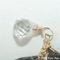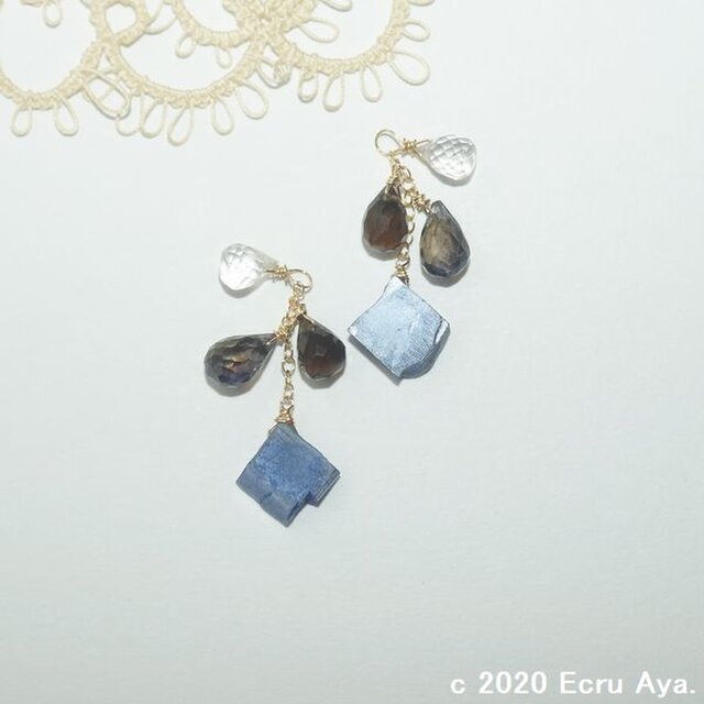 上から宝石質スモーキークォーツAAAのドロップブリオレットカットを、カラーグラデーションで2個、その下に宝石質アイオライトAAAを下げました。