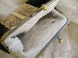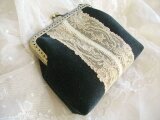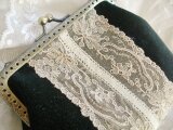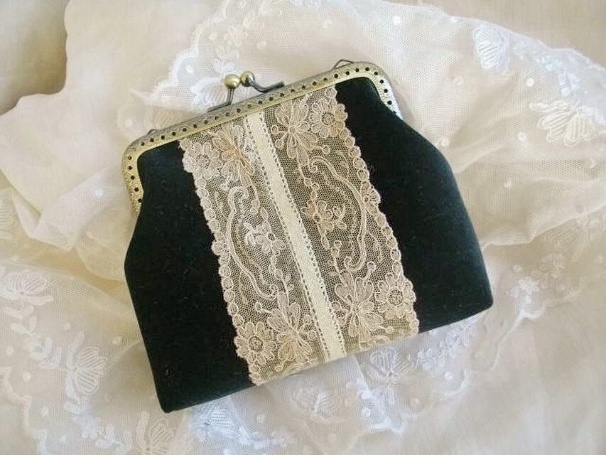 黒ビロードにアンティークレースをのせたがま口ポーチ
