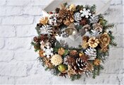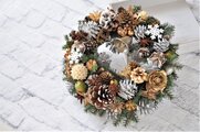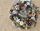 自然素材:松かさ(ホワイトペイント、アイボリーなど)・スターアニス(ブラウン)・ワタカラ・ニゲラ・アンバーバーム(ホワイト)・カラマツ・ウッドプレート(〇型 白)、木の枝・ピナスカプリシャス、など。