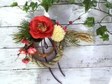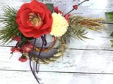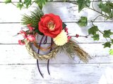 赤の重ね椿とホワイトマムを正面に、桃色の梅を豪華に使ったお正月飾りです。