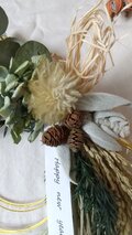 藁縄に柔らかな色合いのプリザーブドフラワーをリボンや飾りと組み合わせたハイセンスなしめ飾りが届きました。妻や娘もとても気に入ってくれました。 もういくつ寝ると・・・とお正月が待ち遠しくなります。 作品の他にThank youコメントのついた可愛らしいフラワーが添えられていたり、手書きのご挨拶が書かれていたりして、作品同様、作者様の温かい思いを感じる体験でした。ありがとうございました。