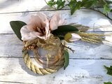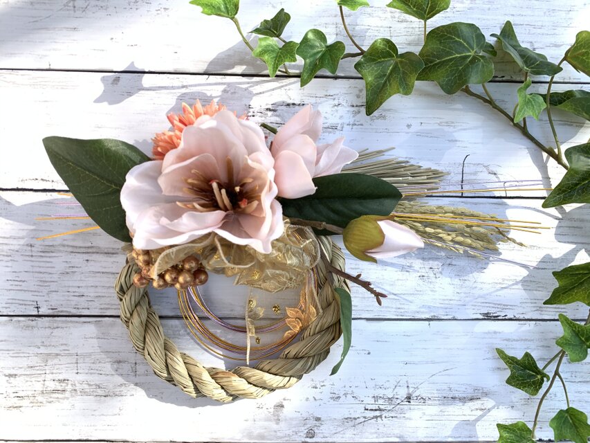 淡いピンクのマグノリアを正面に配し、ゴールドの南天やオレンジのマムを花材にしたお正月飾りです。