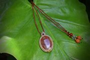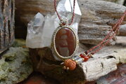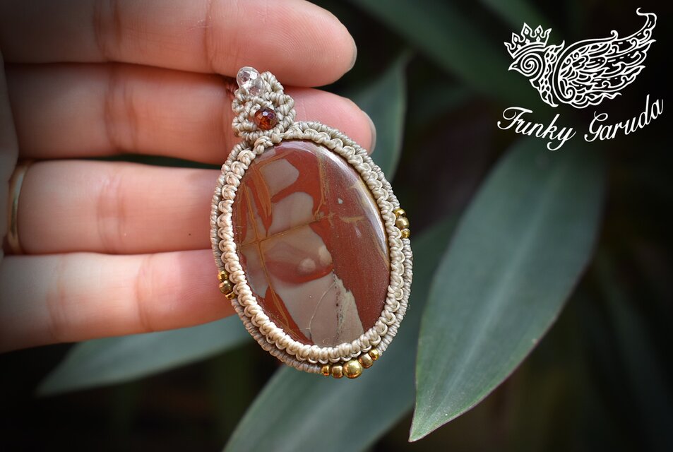芸術的な模様がトレードマークのムーアカイトルースをマクラメ編み装飾を施し、ペンダントに仕上げました。ペンダントのトップの部分には良質なカッティングが施されたガーネットビーズとアクアマリンビーズを編み込み、アンティーク感溢れるクラシックなデザインに仕上げました。
