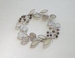 淡いベージュの葉っぱ、白い実、セピア色の実をつけた小枝を、重なり合うようにつないでいます。