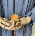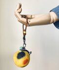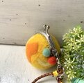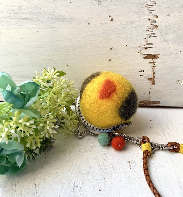 手のひらサイズの球体の羊毛フエルトがま口で、バックの外付けができるタイプです。