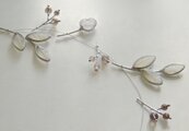 森で集めた小枝をモチーフに、淡いベージュの葉っぱ、白い実、セピア色の実をつけた小枝を、ひと枝ずつ ワイヤーでつないでガーランドにしました。