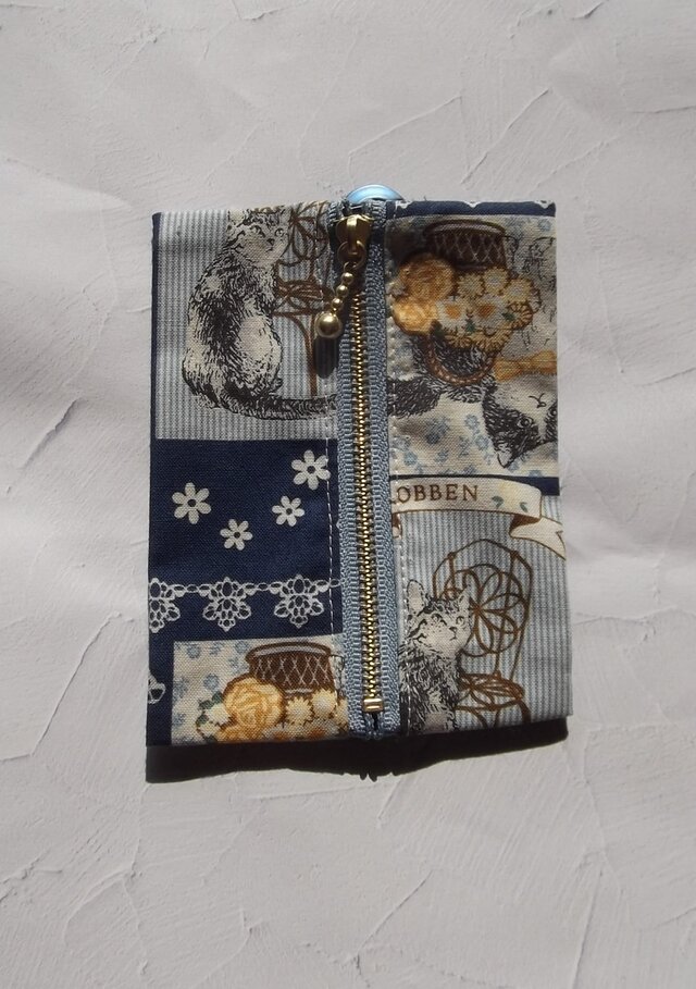 オックス地の紺地に猫の額絵のパネル柄のポケットティシュケースです。(裏地はついていません。)