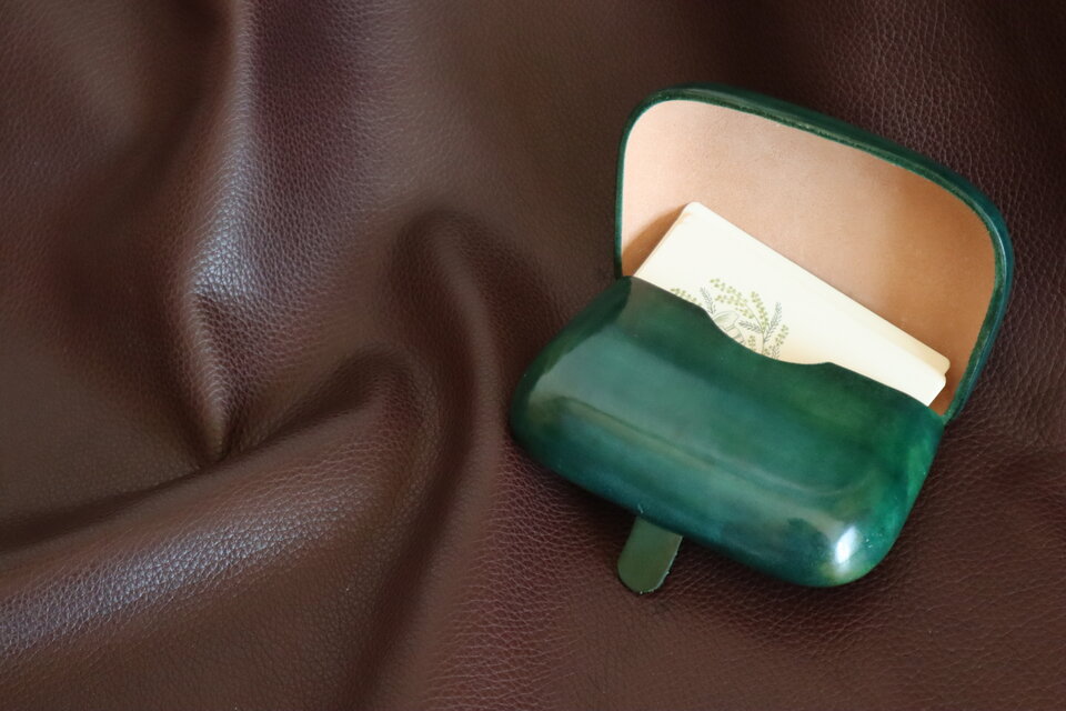 木型をお願いしている家具職人さんから、コインケースのようなころんとした名刺入れ作れないかな?とお話をいただいたことから、生まれたカードケース。