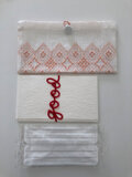 もしアイロンをかける時はタオルを敷いて刺繍の表を下に押すように(表にアイロンをあてると刺繍がつぶれます)半乾き状態の方が綺麗になります。