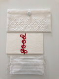 もしアイロンをかける時はタオルを敷いて刺繍の表を下に押すように(表にアイロンをあてると刺繍がつぶれます)半乾き状態の方が綺麗になります。