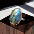 ブルーを基調にしたグリーンやイエローの輝きと、固有の模様が魅力的なこのラブラドライトを、高さを抑えたレリーフの台座に合わせました。
