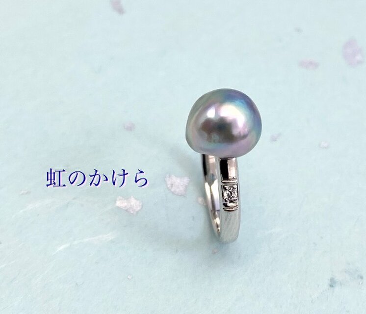 色も形もナチュラルです。それはそれは美しい虹が小さなかけらとなって地上に舞い降りたような。宝物にしたくなるあこや真珠の一粒リングです。余計な装飾はなし。両脇にキュービックジルコニアを1石添えただけのシンプルな作りが真珠の美しさをクローズアップします。ポエジの超オススメの一品です。