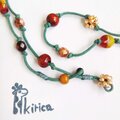 MOKUBAのモスグリーンが美しいロービキ紐に、カラフルなチェコビーズたちを並べた