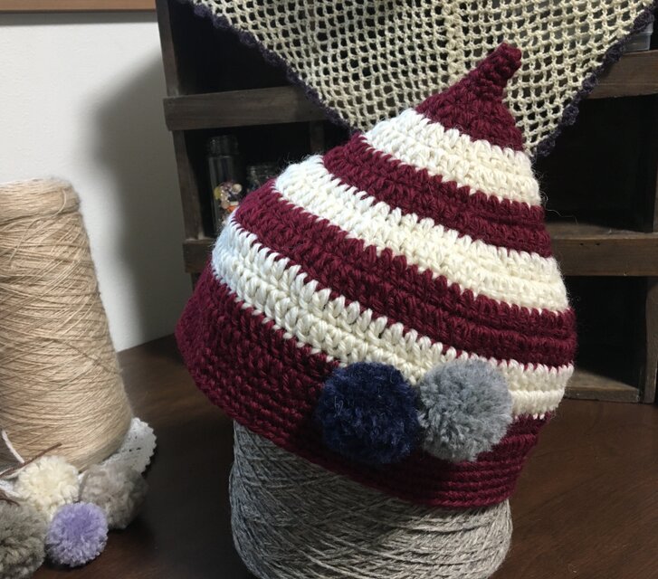 えんじと生成りのしましまにグレーと紺のポンポンを付けました。