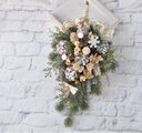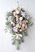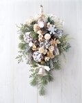 ベージュやグレージュのニュアンスカラーが美しい、ボリューム感のあるスワッグです。白バラ、ドライフラワー風の紅バラをアクセントにどこか時間を超えた幻想的な雰囲気も感じられてとても心惹かれます。 また、スワッグの向きや花器に応じた飾り方を提案して下さっているので、これから色々な表情を見つけて行ければと思います。今回も素敵な作品をありがとうございました。