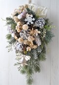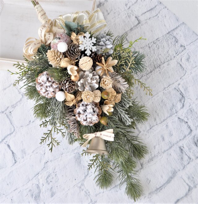 素材:アーティフィシャルフラワ-(造花):コニファー(3種類 一部ラメ付き)・ユーカリ・スノーボール・ゴールドのボール、など。自然素材:松かさ・カラマツ・ワタカラ・トーヒハーフ・スターアニス・ムタンバナッツなど。その他:リボン飾り(英字プリントコットンリボン・クリームとゴールドの艶やかなリボン:どちらも取り外しできません)・オーナメント(シャンパンゴールドのベル・コットンリボン添えて:取り外しできません)・オーナメント(雪の結晶 白、木製 取り外しできません)。